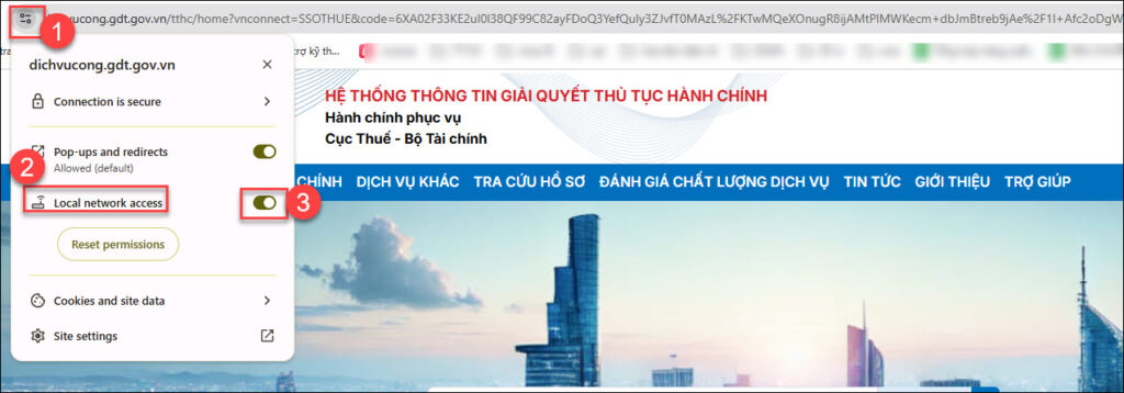 Vào web trình duyệt ở góc trái phía trên link trang đường dẫn, tại dòng Local network acess (Quyền riêng tư và bảo mật) tích biểu tượng cho phép
