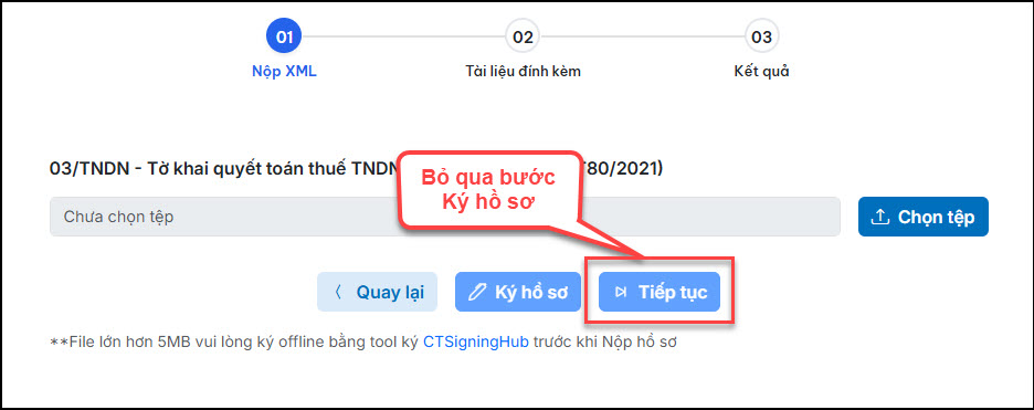 + Trường hợp tờ khai không có Tài liệu đính kèm, chỉ có 2 bước thì bỏ qua bước ký hồ sơ và nhấn Nộp tờ khai