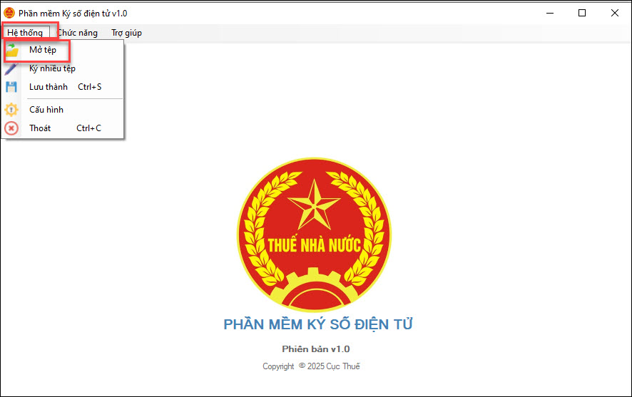Bước 4: Tại giao diện phần mềm ký số vào Hệ thống, chọn Mở tệp, chọn file cần ký số