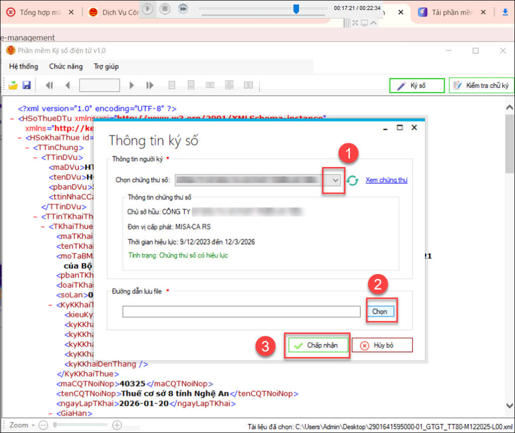 Bước 6: Tích chọn Chứng thư số, Đường dẫn lưu file rồi nhấn Chấp nhận để thực hiện ký số