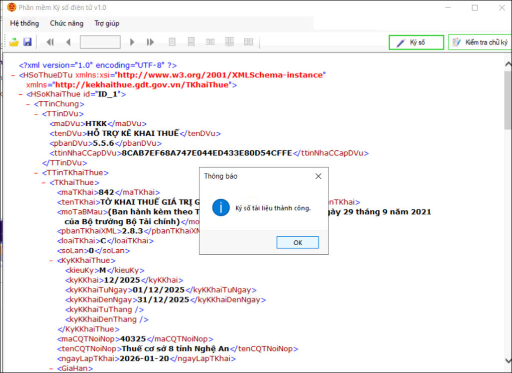 Sau khi ký xong, mở lại tờ khai ở phần mềm itaxview, kiểm tra chữ ký số nếu chỉ có 1 chữ ký số báo hợp kệ thì thực hiện tiếp Bước 8 để nộp tờ khai